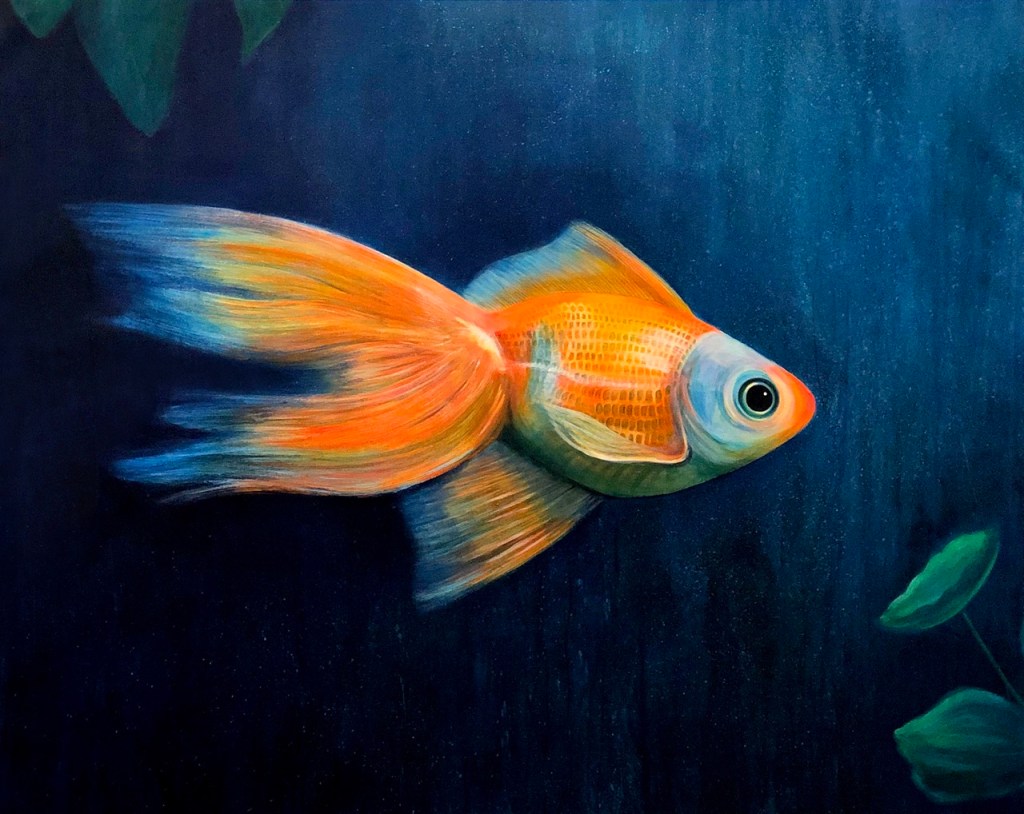 “There’s something so simple yet beautiful about it. It’s kind of a juicy painting. The color just calls you in. I think the absurdity of having something so small and insignificant be blown up to that scale is fun. And you can really appreciate the ethereal nature of the fins and scales,” she described.