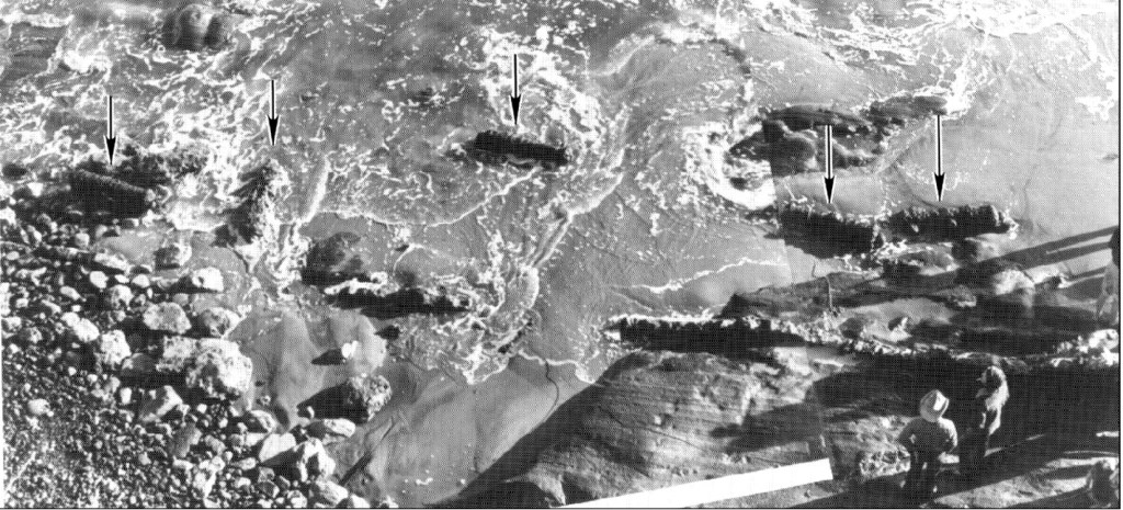 The five Goleta cannons were found on the beach below the south tower in 1981. The station engineer related that in 1978 a steeplejack working on that tower noticed, from his perch on top, a line of black tubes lying on the beach below which he thought might be something significant. It turns out they were. Fortunately, another observer on the beach saw them again in 1981 and called for support to save these artifacts.