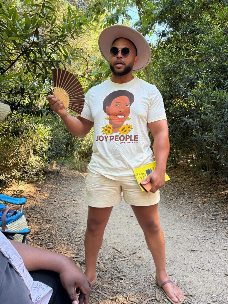 One of the Casitas this year was created by Colleen M. Kelly, who designed a Poet’s Perch, in homage to cherished Poet Laureate Emerita, Sojourner Kincaid Rolle (1943-2023). The late poet would have celebrated her 81st birthday on Monday, August 26. Along with Sojourner’s husband Rod Rolle and several of her close friends and colleagues, Kelly unveiled her Poet’s Perch that day. The art installation consists of a tall, 12-foot, upside-down tree, salvaged from the Botanic Garden with a kite that reads Joy (Sojourner’s given name) and Sojourner’s poem, “Hosanna” wrapped around the top.