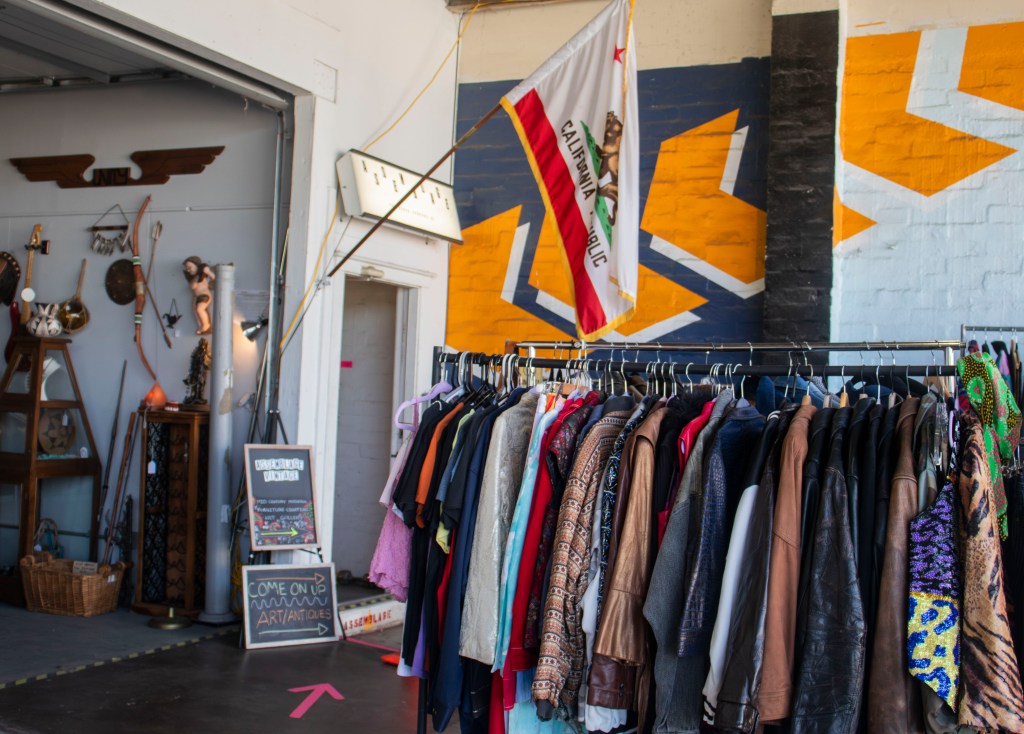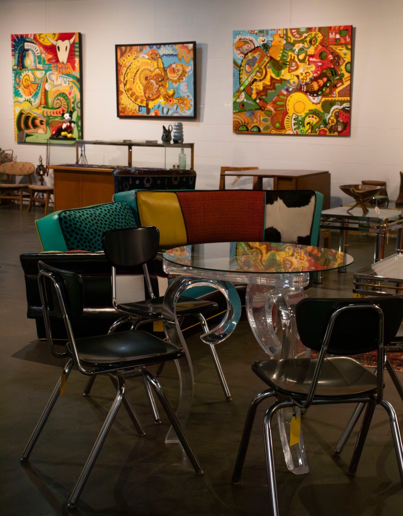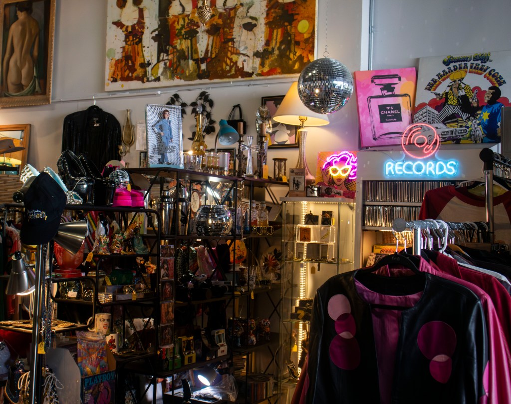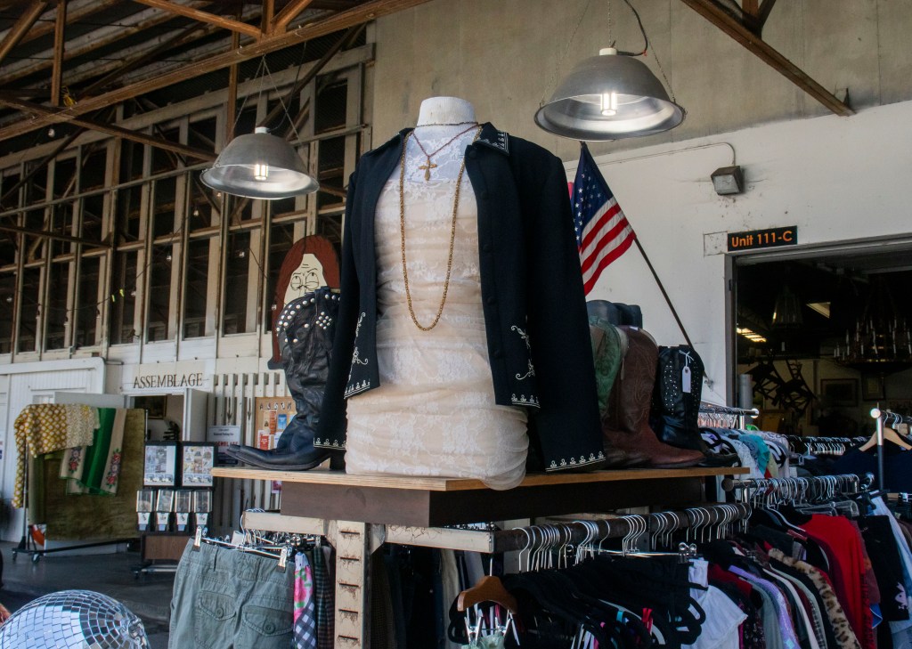 The warehouse that encases Assemblage features a ground level filled with racks of vintage clothing, memorabilia, jewelry and records, plus an art and furniture showroom upstairs. Each seller’s corner has a unique theme with aesthetics ranging from cowboy to disco.