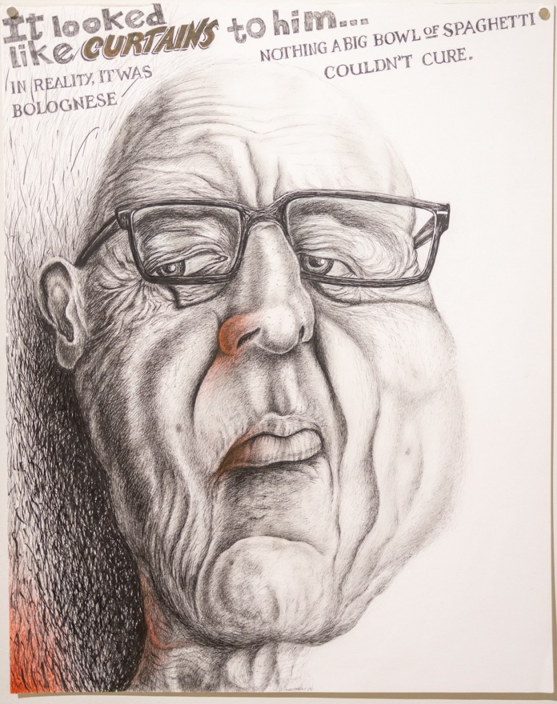 “Guston was mentioned throughout all of his sketchbooks. I know he saw the big Guston show in San Francisco in the early ’80s because he references it, so I thought it’d be really nice to put him into context of demonstrating how this isn’t just goofy caricature. There’s a tradition of using caricature to really convey complex meaning,” said Linton.