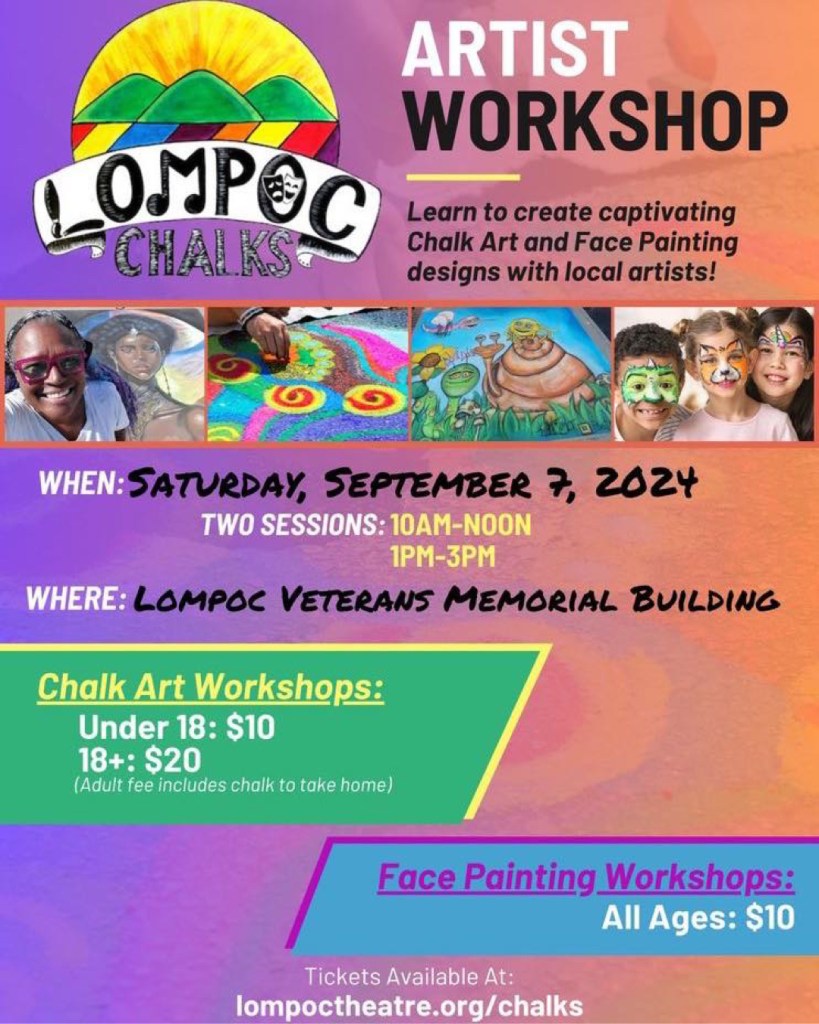 On September 7, Lompoc Chalks is hosting a special Artist Workshop at the Lompoc Veterans Memorial Building. Artists will be taught the craft of chalk art, learning techniques from instructors and gaining materials to use in October’s festival. There will be two 2-hour sessions, the first being 10 a.m. to noon. and the second being from 1 to 3 p.m.