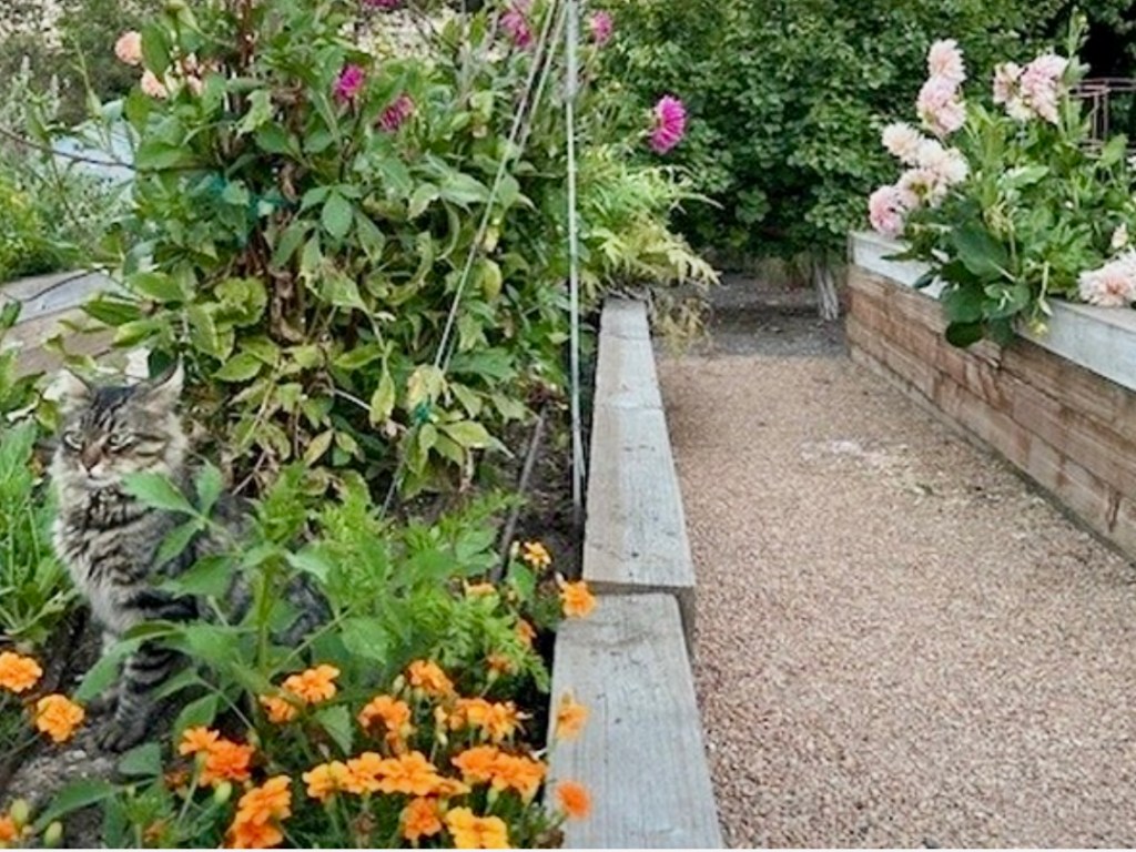 Mr. Fred the cat — hiding in “his” garden, above — is a feral-turned-playful addition to my friend Austin Lampson’s menagerie. Austin and her husband Kai have been gently nurturing Mr. Fred over the past three years. Mr. Fred apparently agrees that it’s a good season for the garden. Or for guarding. Or both.