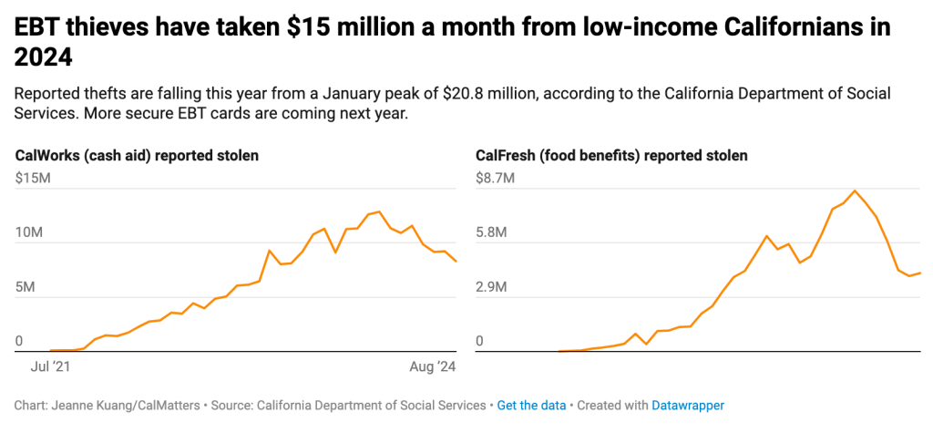 Reported thefts are falling this year from a January peak of $20.8 million, according to Department of Social Services data, but California continues to lose more than $10 million a month. In the three-year period that ended in August 2024, low-income Californians have reported $242 million in cash aid and $119 million in food benefits stolen.