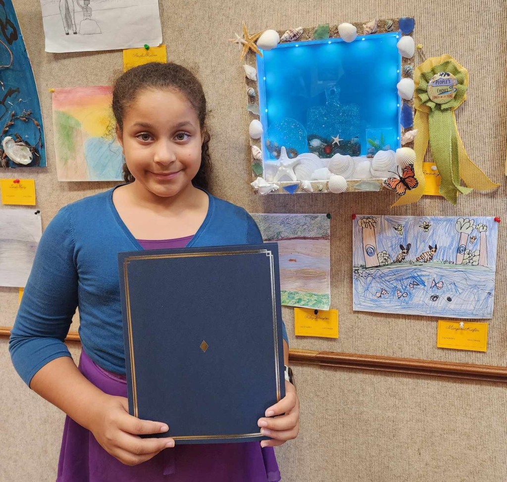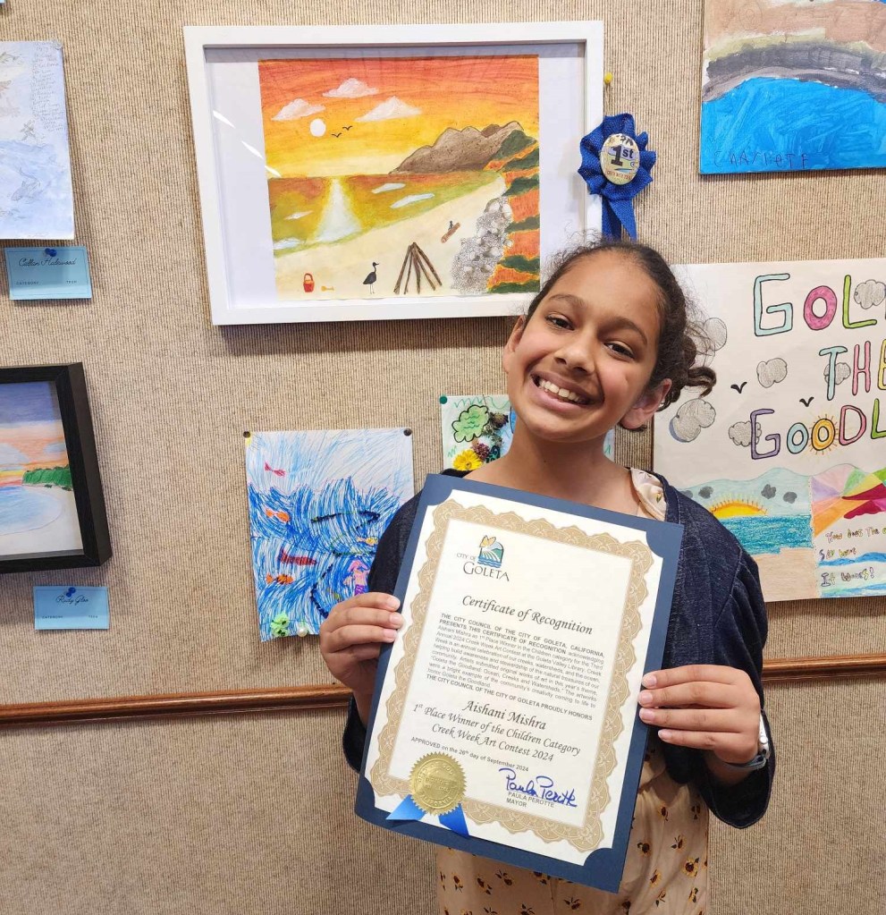 GOLETA, CA, September 27, 2024 – More than 100 people gathered in the Goleta Valley Library’s Community Room last night, September 26, for a Reception to find out the winners of the 3rd Annual Creek Week Art Contest. An impressive 114 people participated in the contest, submitting a piece of art using this year’s theme “Goleta the Goodland: Ocean, Creeks and Watersheds.” The submissions included a wide array of different mediums including paint, watercolor, photography, collages, mixed media, fabric, and more.