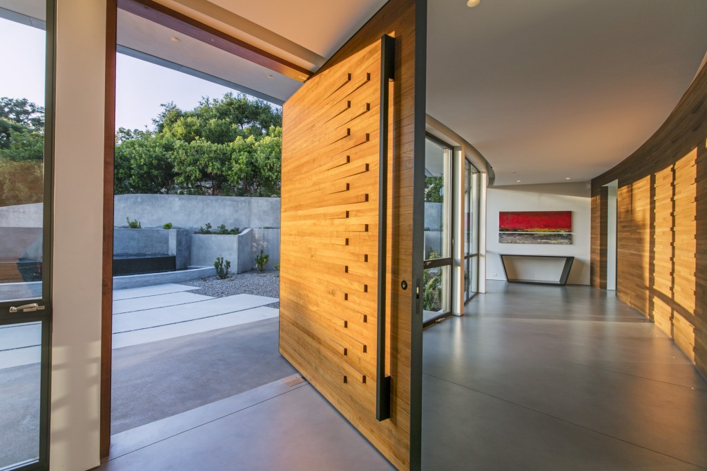 Past an entryway fountain and through the front door — a pivoting walnut monolith measuring about ten feet high and just as wide — the Reichels moved in on Christmas Eve, taking in the view through nearly 15 feet of floor-to-ceiling curved glass. To one side, the spacious kitchen hides behind a maple wall with a pocket door. Their primary suite takes up the north end of the bow-shaped home, and a laundry room and guest quarters fill the other. All said, three bedrooms and three-and-a-half bathrooms cover 4,500 square feet; downstairs, there’s a four-car garage and Keith’s wine cellar, with room for 2,900 bottles.