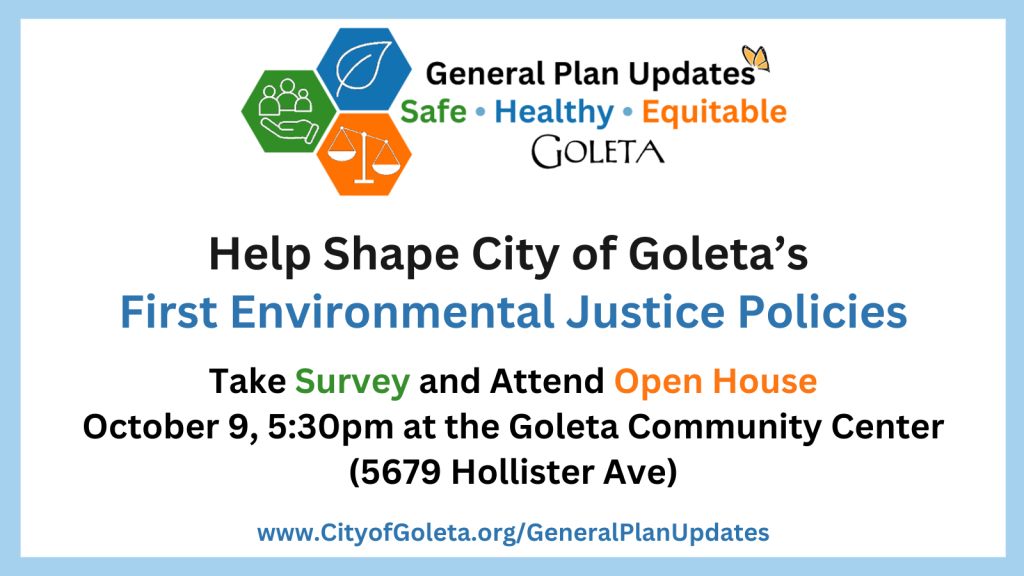 The Community Open House takes place in the Goleta Community Center at 5670 Hollister Avenue on Wednesday, October 9, 5:30-7 p.m. Attendees can expect to hear more about environmental justice policies and the city’s goals. Participants are invited to contribute to the forum and engage with city officials to help shape these new policies and ensure they are representative of the community members’ concerns. Facilitators will be translating to Spanish.