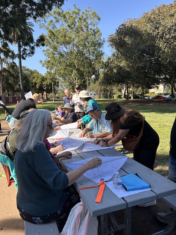 People gathered at wooden picnic tables in Alameda Park, crafting kites printed with handwritten inspirational phrases, such as “Bring them back home,” referring to the captives still being held in Gaza.