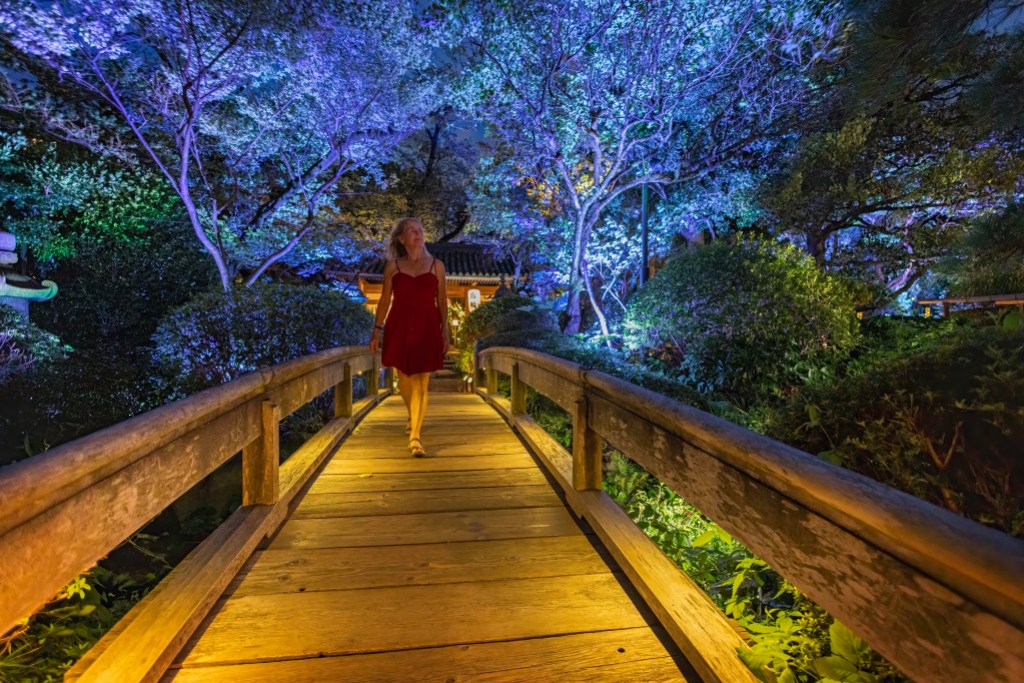 On our first night in Tokyo, light showers reprieve the humid heat, we wander through the Prince Hotel’s garden, psychedelic pink and lavender fairy lights illuminating a garden and a lawn with playful crescent moon swings. We peek inside a lovely Shinto shrine, a stroll over a bridge spanning a pond with requisite koi, and inhale the scent of seasonal flowers. With the fall of the Shogunate in 1868 at the end of the Edo period, many of the larger land tracks owned by the Shogunate or their feudal lords for over 250 years changed hands. With land at a premium, some estates were bought by Japanese merchants-turned-hoteliers, and fortunately some of the wisest hoteliers embraced a sense of stewardship to maintain the land’s century old pines, ponds, stone pathways, and gardens, contributing their part to Tokyo being a city of meticulously trimmed and preened sanctuaries of green, offering the sounds and reflections of water and silences in the midst of a mega-metropolis. Lightheaded from jet lag and no food, I’m exhausted and propose we opt for a pricey meal in-house, but Macduff points in the direction of the station, just down the hill. “There’s always something around a train station.” Indeed! We enter the wooden façade, an izakaya, or pub, brimming with locals, waves of laughter, toasts, and cheers from a long table of men all in white shirts, black slacks, same haircut, and a few women in skirts or pants drinking and feasting on grilled chicken. “Irasshaimase!” The waiter declares California is cool and brings us cold beers, asking me to “like” them on Google — you bet.