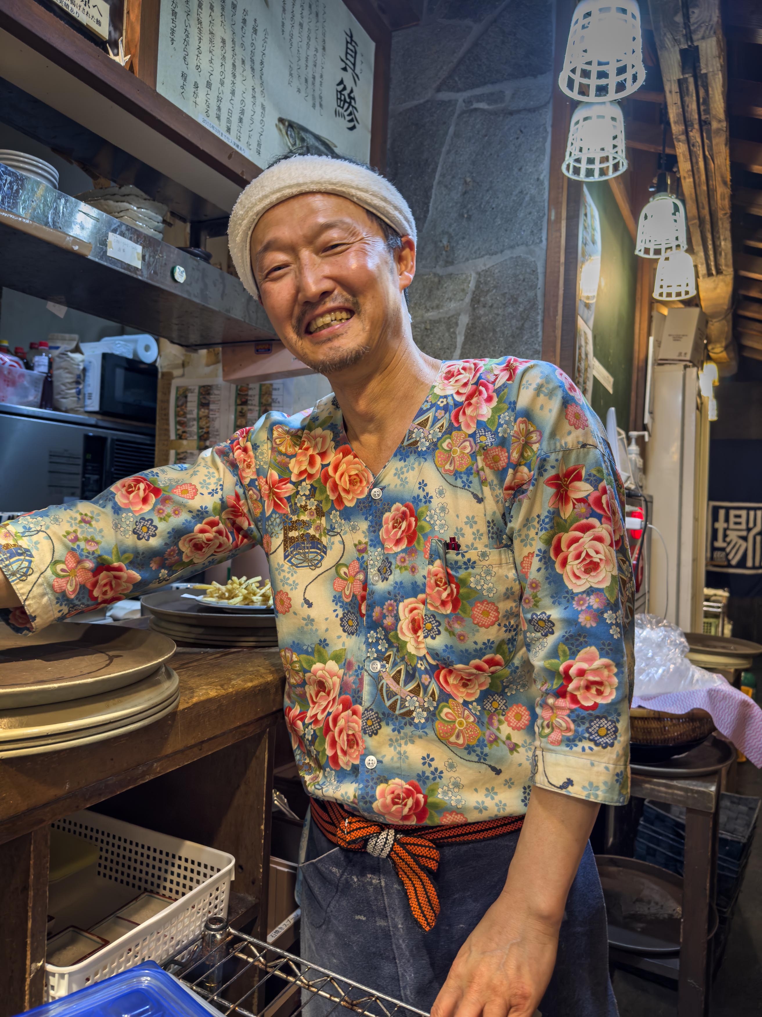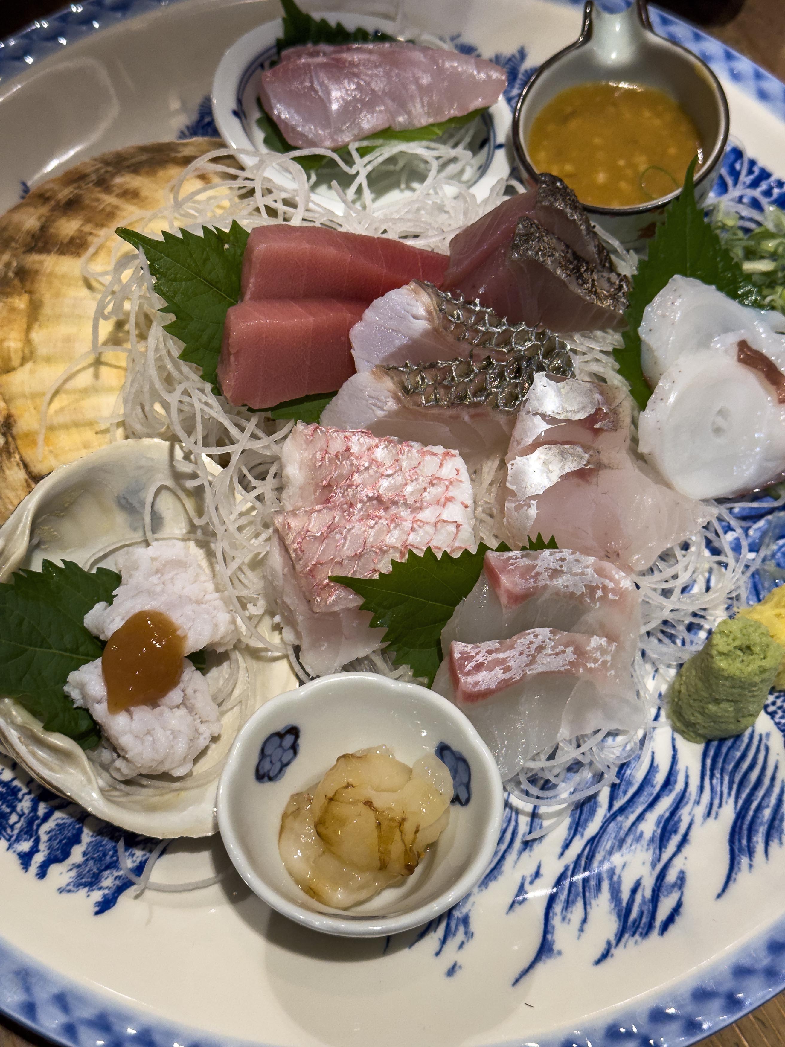 At night, we try another restaurant by our station. Local fishermen deliver daily fresh catch, at Yompachi Gyojo Shinagawa, a sashimi and grilled fish restaurant. The wood-lined walls at Tsukiji Yonpachi are decorated with black and white photos of fishermen at work, the atmosphere is radiant, and they even brew their own sake. We return two days later in a typhoon downpour that only seems to elevate the spirits inside. Who wouldn’t with a menu offering aji (horse mackerel), hon maguro (bluefin tuna), baby amberjack, isaki (threeline grunt), and hirame (flounder)?