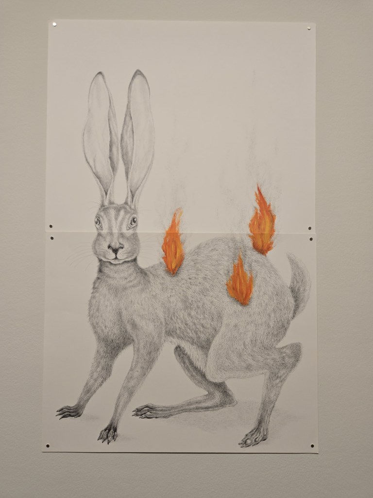Certain single images jump out of the mass of imagery, like “Burning Animals, Jack Rabbit” and “Study for Apple-stuffed Head,” both tinged by a soft-edged surrealist/grotesque touch. It is a testament to Puccinelli’s personalized vision, audacity, and honesty — not to mention a wily and leavening sense of humor — that his art often juggles matters of mortality, social injustice, and life affirmation. And his own brand of artworldly clowning.