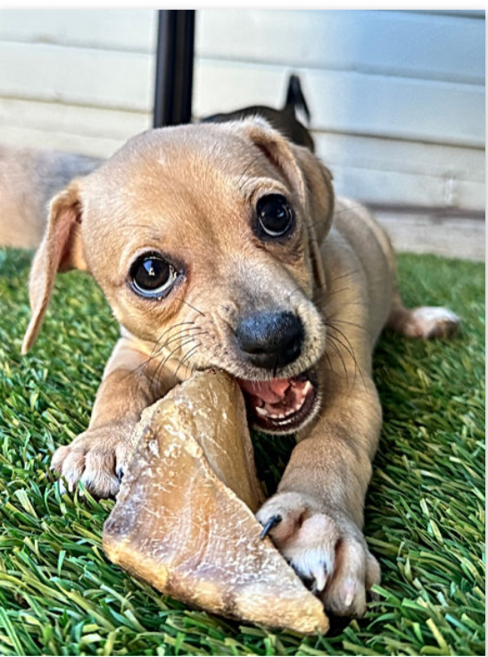 Olive is a curious female Puggle puppy with a knack for exploration! This little explorer is always on the lookout for new adventures and isn’t afraid to investigate every little space. Olive is a little over 3 months old and should get to be about 15 to 20 pounds when full grown