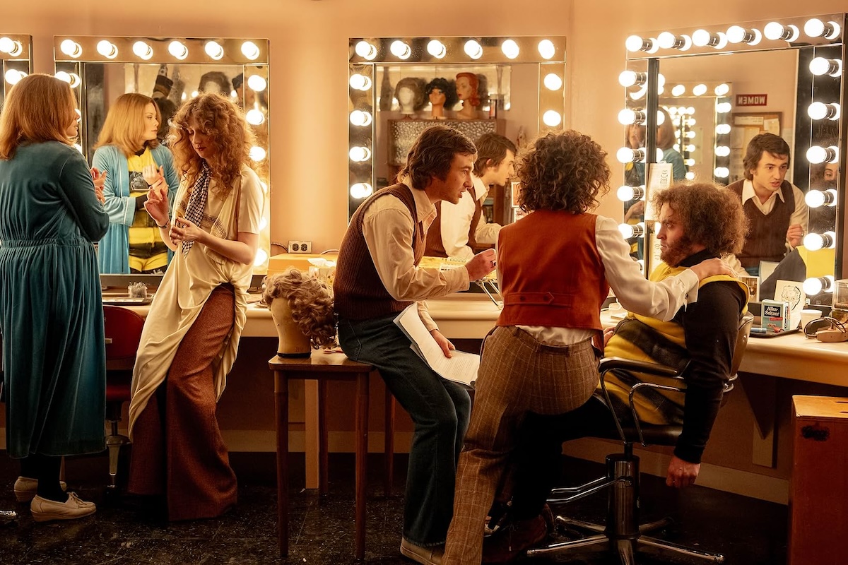 More than most films with specific historical fixings, Reitman’s SNL origin story will strike viewers differently, depending on one’s own experience with and opinions of the show. Reitman himself can tell the tale with objectivity and a satirical zing, having been born a decade after its launch. He freely lambastes the cynical network duplicity (creepily embodied in Willem Dafoe’s portrayal of the jumbo-bespectacled corporate suit) and damning depictions of the unapologetic crassness of Johnny Carson and Milton Berle, representing the late-night TV Old Guard that SNL sought to revolutionize and topple.
