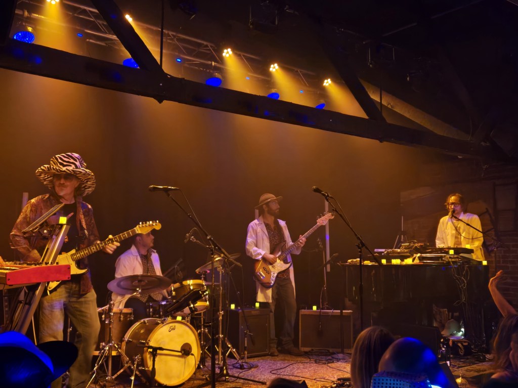 After a solo set which included Gill’s gleeful anti-anthem “Nonsense Brigade,” his fine band joined the stage — in lab coats, natch — and upped the energy ante, from Gill’s classic “Joy” to a groove-lined take on Neil Young’s timeless (and yet seasonally timely) “Harvest Moon” and the funk-fueled “Sweet Spot.” Magic happened, as well, on a slippery-grooved “Abracadabra,” with Skene joining in. Dance fever, of the underground, hippy sort, took over the room.