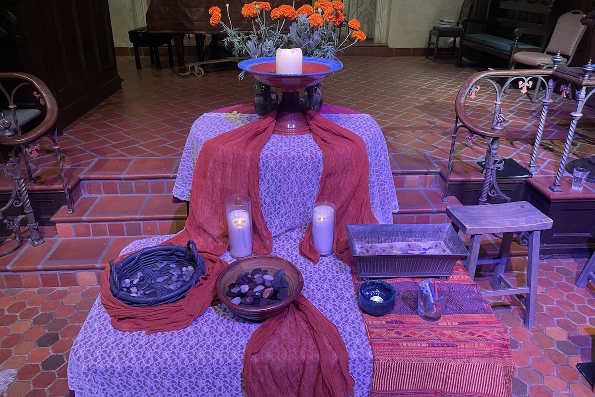 Candles flickered on the center shrine as people lined up and took turns moving stones from one bowl to another filled with water, in what I can only guess was the symbolic gesture of emotions flowing through these “buckets of feeling,” which also included anger and determination.