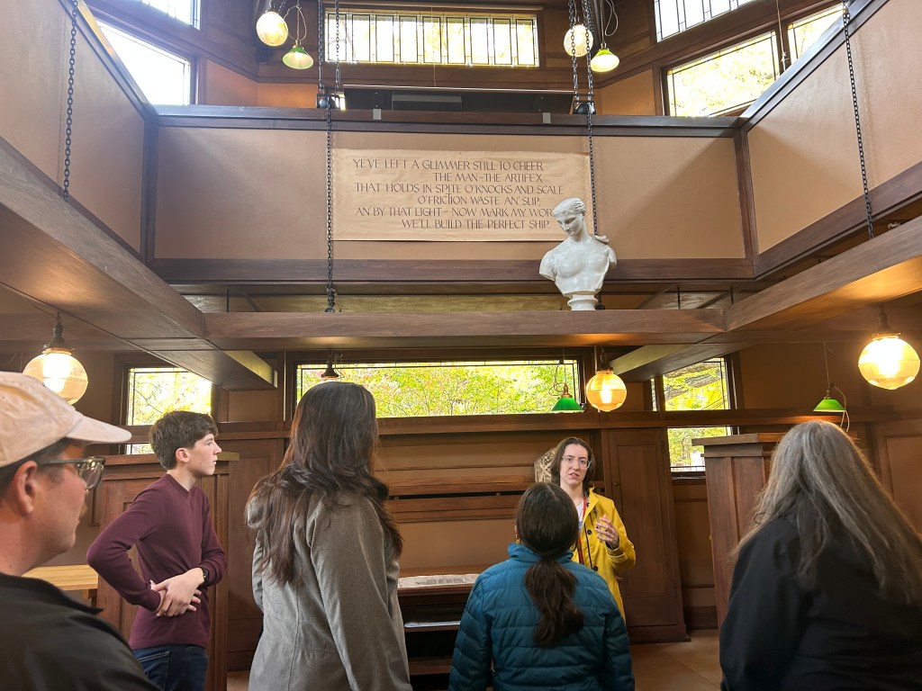 Our tour was led by Amelia, a docent with a history background who relayed interesting facts and stories. I enjoyed imagining the Wrights’ lifestyle: Creating their home and raising their family, while Wright was also developing his professional practice. Here, Amelia points out the light in the octagonal library in the studio, a space where Wright met with clients to review plans: