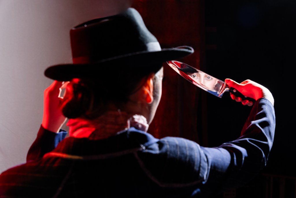There is much to love about this department production (adapted by Simon Stephens, directed by Annie Torsiglieri), but Oxley’s performance as the slick and brutal Captain Macheath is at the top of the list. Oxley seductively accomplishes the magic trick of the character: Making the audience believe that Mac “the Knife” is, in fact, as charming and charismatic as the characters onstage lead us to believe. Mac is a cult hero because the script says so — but for the illusion to hit, the audience must also take the bait, forgiving this magnetic criminal even his most cruel betrayals. Suffused with passion (madness?), Oxley’s Macheath is nigh unstoppable, moving from one doomed relationship to the next, never truly able to ungrasp his conquests. This fever is illustrated through intense and insightful choreography by Christina McCarthy, including a twisted, intimate wartime re-enactment and a brothel ballroom twirl that conjures the hungry anticipation of a tango and the violence of a Danse Apache.