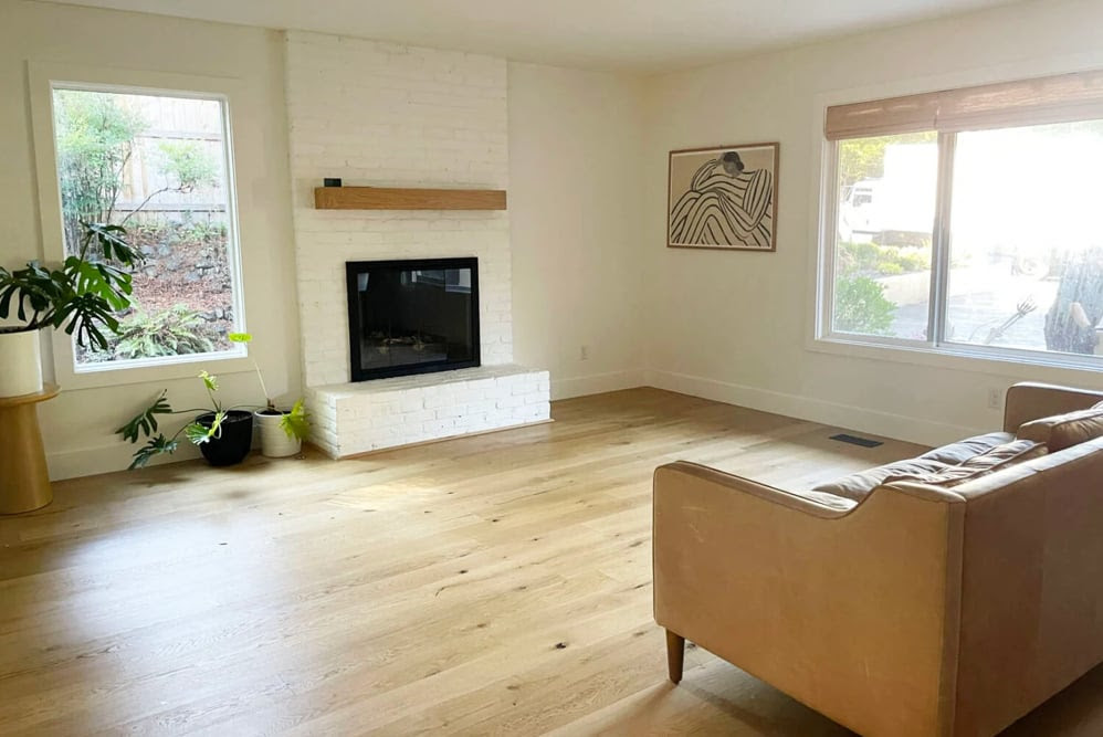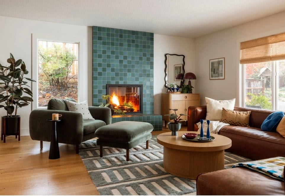 It’s a dream of mine to have someone come take a look at one of my rooms, get a sense of my style, wave their magic wand, and transform my space. No mess, no decisions, no expense. Yes, of course, in my dreams everything is free! Here’s a two-part before-and-after living room story from our friends at the Emily Henderson blog. They published the introduction last week, but I decided to hold off from sharing with you until I saw the results. I didn’t want you to have to wait a week, and of course I wanted to make sure that I approved of the “after.” You can see the “before” room above. It’s pretty decent, right? But wait for it! Here is the ’70s inspired, blue-tiled fireplace, “after” shot: