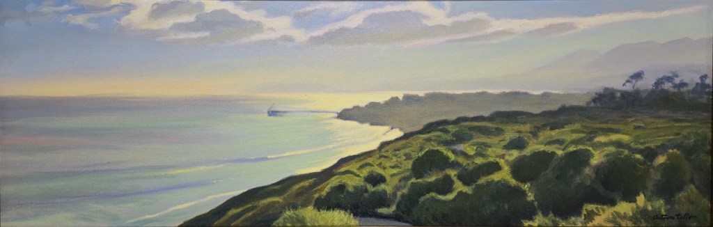 Tello’s touch is seen here in the long, willfully horizontal view of idyllic Carpinteria land and sea, “Evening of Communion, Rincon Bluffs.”