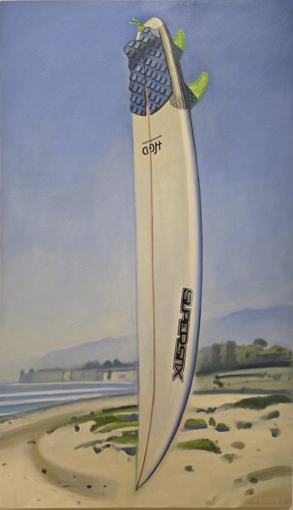 While the lion’s share of Oak Group paintings sidestep manmade structures or objects, there are compatible outliers in the show. Hank Pitcher, who has painted many a landscape and beachscape for decades, shows one of his surfboard portraits, “Eric’s Board at Sands Beach II,” looming vertically in an almost figurative way. But the board/figure surrogate appears slightly detached from the fuzzy beach scene background in the painting, as if levitating in our faces.