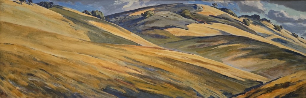 Another founder is the late, great guru-like figure Ray Strong, a lifelong devotee of plein air paintings whose work can also be seen in the tableaux scenes in the Santa Barbara Museum of Natural History. Strong’s inspired touch is exemplified in the canvas “Harvest Fields, Santa Ynez Valley,” a composition awash in undulant waves of golden fields.
