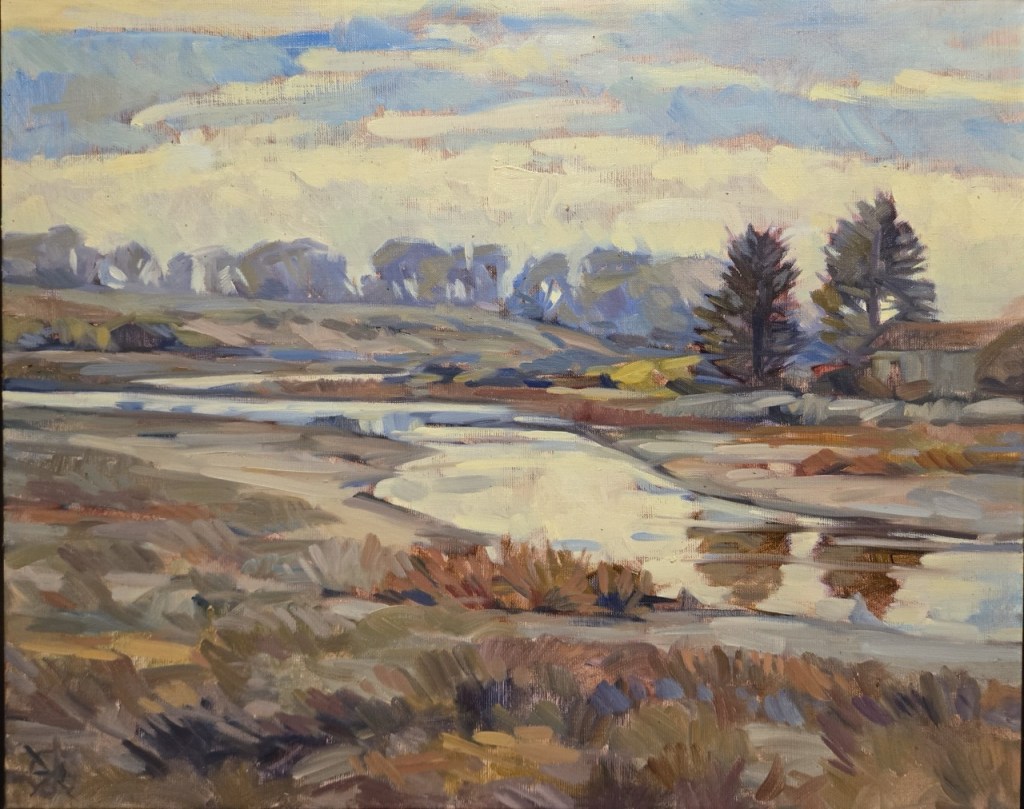 For her part, Kerri Hedden leans into the green and moisture-laden ground in “Spring Rain,” with elegant painterly style. Whitney Brooks Abbott, whose work has often featured rustic, luminous interiors and rusty pickup trucks on her family’s Carpinteria property, heads more fully into the natural realm with her impressive canvas “South-Moving Cloud over North Campus,” energized by her loose-brushed, micro-rhythmic approach.