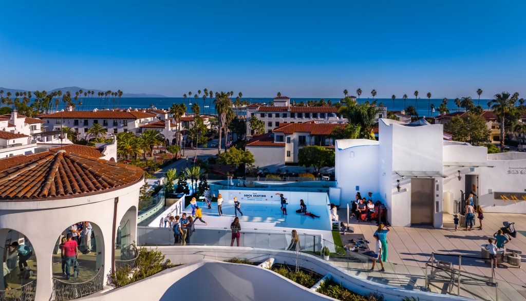 I had the pleasure of experiencing this fun in real life — it was so nice to be able to enjoy a traditional winter activity in the Santa Barbara afternoon sunshine. I can attest that the frictionless material is easy to move around on for all ages, including a UCSB college student like me. All you need to do is take off your shoes and don your socks to have a spinny time. You can show off your moves without the pressure to wear skates and if you fall, you can easily get back up again. The synthetic ice floor is cooled off by fans to keep it slippery, and there are cotton snowballs in the rink to have a friendly snowball fight if you feel so inclined. I also enjoyed the fact that the location of the rooftop rink showcases a stunning downtown view of Santa Barbara and the Santa Ynez Mountains for adults to enjoy. And speaking of adults — the rooftop is also home to happy hour events and weddings during the winter, to warm up the whole community.