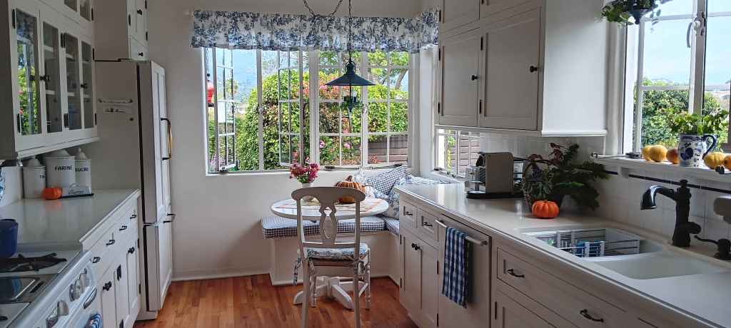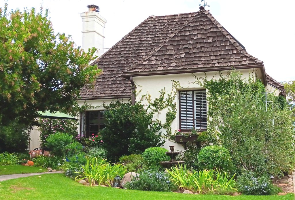 Bonnie and Roger Runjavac, the home’s third owners, clearly love their home — they have lived here since 1978. In addition to the picturesque front facade, the home has an expansive view of the foothills from the back garden. Their “little English cottage,” says Bonnie, “has the bones of a duchess and the heart and soul of a saint.”