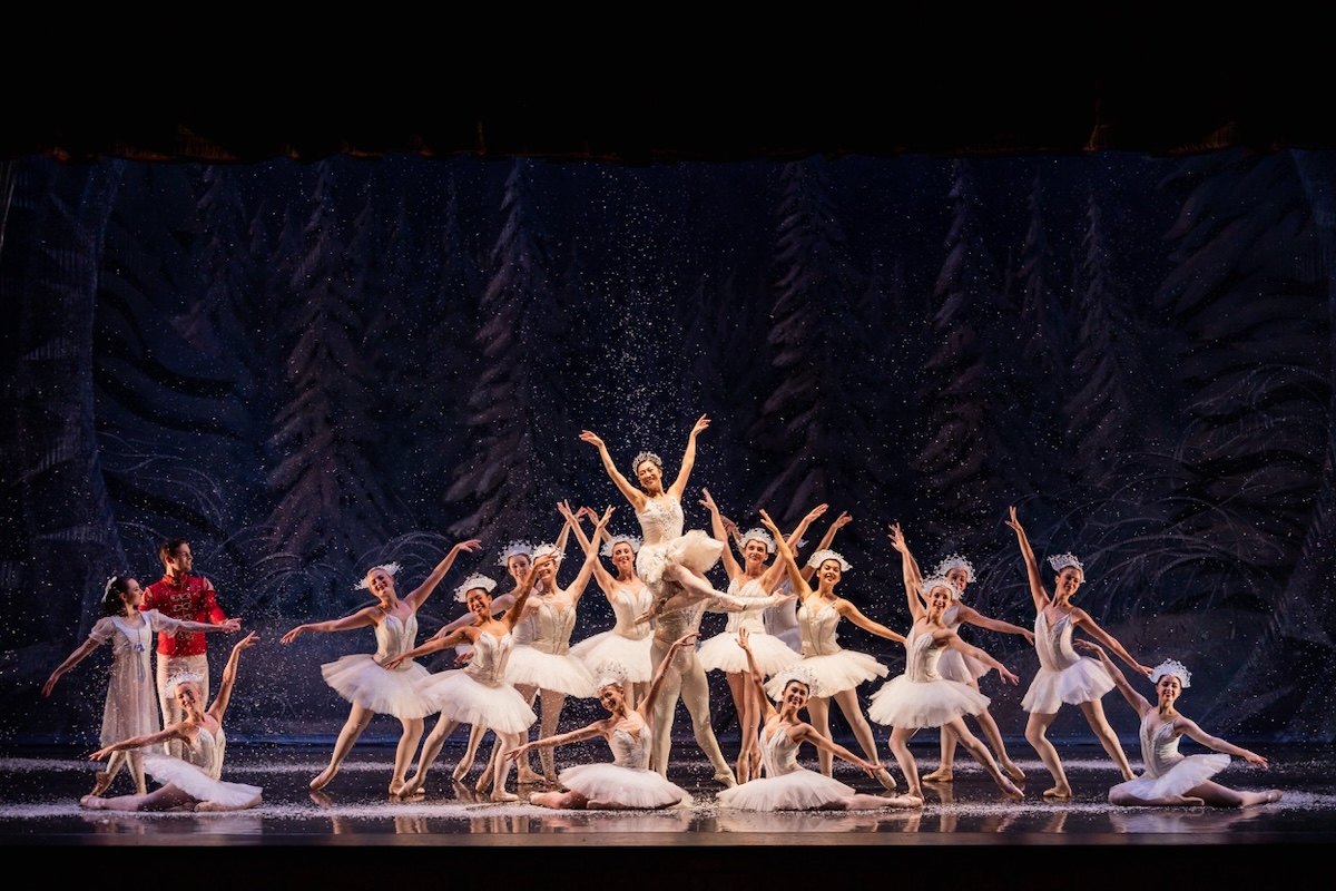 The rat army is defeated, and from the wooden Nutcracker emerges a handsome prince, who escorts Clara to the Kingdom of Sweets. Clara must first pass through the land of the dancing snowflakes before she can take her place beside her new love, in the magical kingdom. The Kingdom of Sweets is presided over by the Sugar Plum Fairy, danced by Akari Kato and Saori Yamashita, and her Cavaliers, Harold Mendez and Ryan Lenkey. The Prince recounts his adventures to the courtiers, and then he and Clara are entertained by a series of performances that include the famous Spanish (“Chocolate”), Chinese (“Tea”), and Arabian (“Coffee”) variations, the “Waltz of the Flowers,” and the “Dance of the Sugar Plum Fairy.”