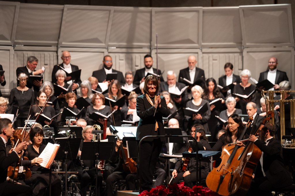 Collectively, the weekend’s playlist ranged from the 15th-century German song “There Stood in Heaven a Linden Tree” (the Quire’s reading of an arrangement by Susan LaBarr, b. 1981) through a bite-size portion of Handel’s Messiah, sung by the Choral Society in the in-house crowd-choir. We also got fresh twists on the standard Christmas Carol jukebox — the stuff of SBCS’s Mark Wilberg–arranged “Joy to the World” and their Randol Alan Bass–arranged closer “We Wish You a Merry Christmas” and Quire’s traditional finale of “Silent Night,” via Malcolm Sargent’s tranquil arrangement.