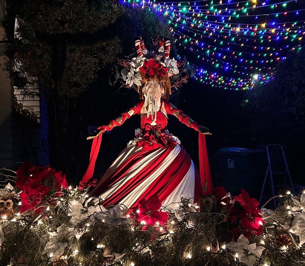 Walking home from Ensemble Theatre’s performance of Million Dollar Quartet the other night, I happened upon this less traditional light display in the front yard of the home at the corner of Anapamu and De La Vina Streets. This awesome apparition is one of my favorite perennial neighborhood creatures. You may recognize her from Halloween, when I shared her spooky diorama here. This time of year, she’s donned a candy-cane-horned persona: decked in holly and mistletoe, and full of the holiday spirit!