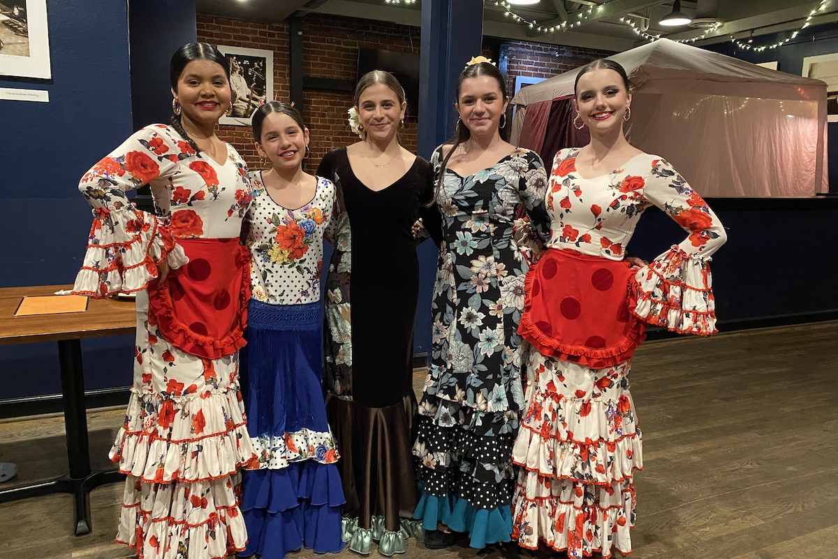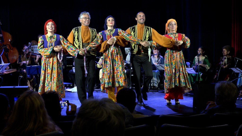 The show featured a number of colorful group dances. Some of my favorites were a Lebanese dabke performed by members of the UCSB Middle East Ensemble, traditional and contemporary Hawai’ian dances by Hula Anyone, two Fiesta favorites by Flamenco! Santa Barbara — sevillanas and moretangos, and a Bollywood piece by Dance Ojai. King’s academy students, who are on her pro track to becoming professional belly dancers, performed a beautifully synchronized veil dance to “Bir Demet Yasemen,” a recording by the famous singer and Oud player, the late John Bilezikjian. Bilezikjian was beloved by folk dancers and belly dancers all over the U.S., and he was featured in many Hollywood films, including Lawrence of Arabia. I once interviewed him for Folk Dance Scene Magazine, and learned that he grew up in a large family in Los Angeles in which Turkish, Greek, and Armenian were spoken.