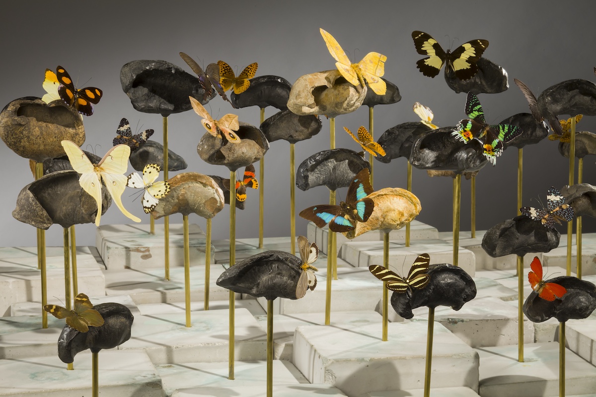 Channeling his scientific interests and research into distinctive sculptural and multimedia artworks, Robleto embeds meanings and metaphors beyond and beneath the deceptively calm and lyrical surfaces of his art. A butterfly display case; a series of kaleidoscopic, constellation-esque vistas; and a series of gold-plated “jewelry” take on new and deeper reflections — once you know the secrets in the art’s bones.