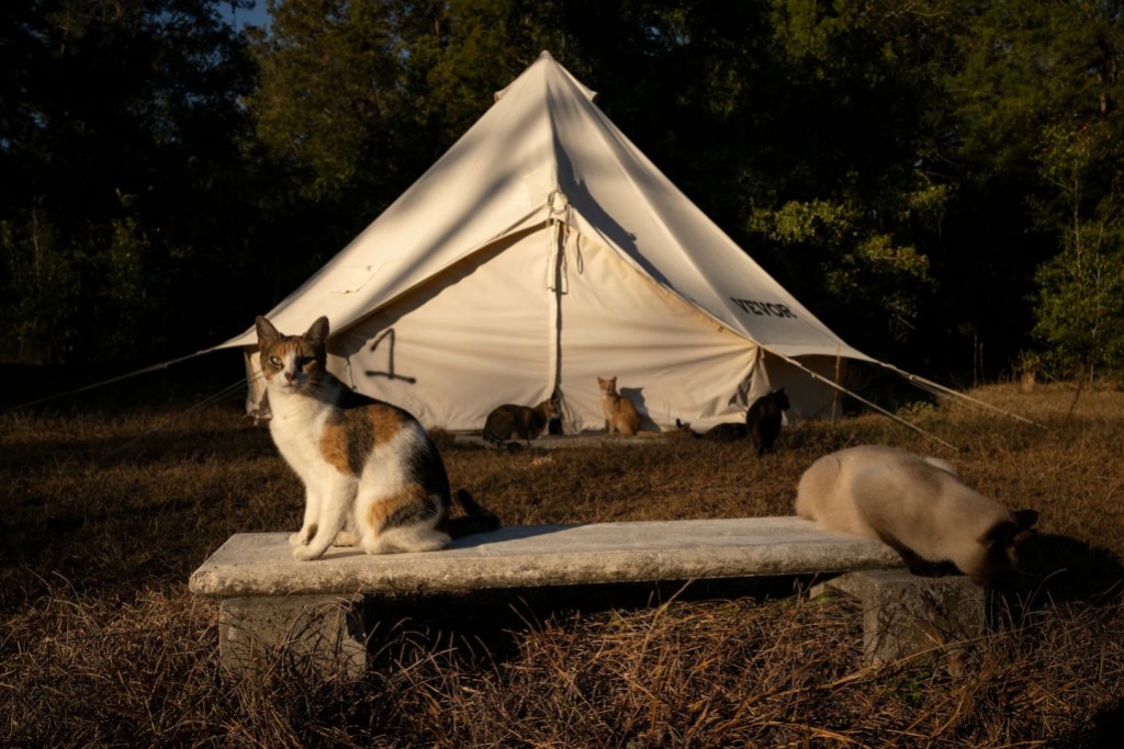 Purradise Springs is a glamping resort in Florida where 130 rescue cats rule the roost. Run by a couple who admit that the cats are their first priority, human guests coming second, the outfit is much more a cat rescue than a resort-style getaway. In fact, on their airbnb profile, they describe their intended guests thusly: “Cat fanciers over the age of 18 are welcome; dogs, obviously, are not,” and they further specify that people with allergies and “anyone who can’t stomach cat pee” should look elsewhere. They offer three deluxe camping tents with real beds — “purrts” if you will — and lots of kitties to keep everyone entertained.