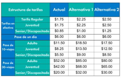 Para generar ingresos adicionales de aproximadamente $1.5 millones para ayudar a llenar ese vacío, MTD ha elaborado dos escenarios alternativos propuestos, que se muestran en la tabla a continuación. La alternativa 1 consiste en una tarifa en efectivo de $2.25 con pases con un descuento moderado, mientras que la alternativa 2 consiste en una tarifa en efectivo de $2.50 con un mayor descuento en los pases.