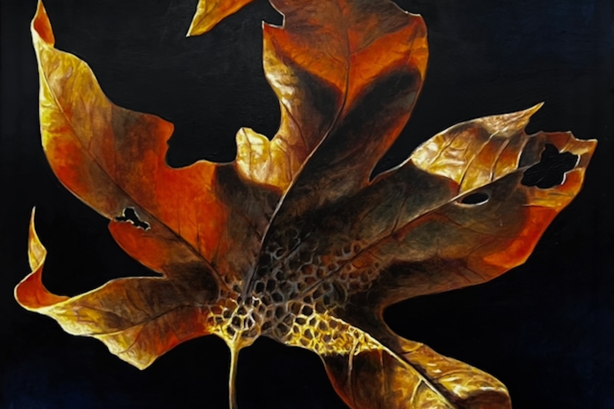 “For some years, I have collected dried-out old leaves, mostly sycamores, holding them up to the sun to illuminate them, and then painting, from life or from photographs, the imagery revealed by the light,” said Rohde in his artist statement. “I’m inspired by the hidden life and beauty residing in something so common and so negligible that we literally crush them beneath our feet as we walk. To me, these are sort of spiritual paintings, hinting at a life within objects that we consider to be completely dead and useless.”