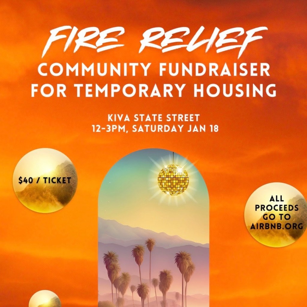 Local real estate professionals are mobilizing to provide relief to the fire victims in many ways. One tangible effort is the in-person fundraiser shown above, being held next Saturday from 12-3 p.m. at Kiva Cowork, 1117 State Street. Avi, Garrett, and Joe from The Santa Barbara Group are organizing the event. Show up, or reach out to learn more about how you can help.