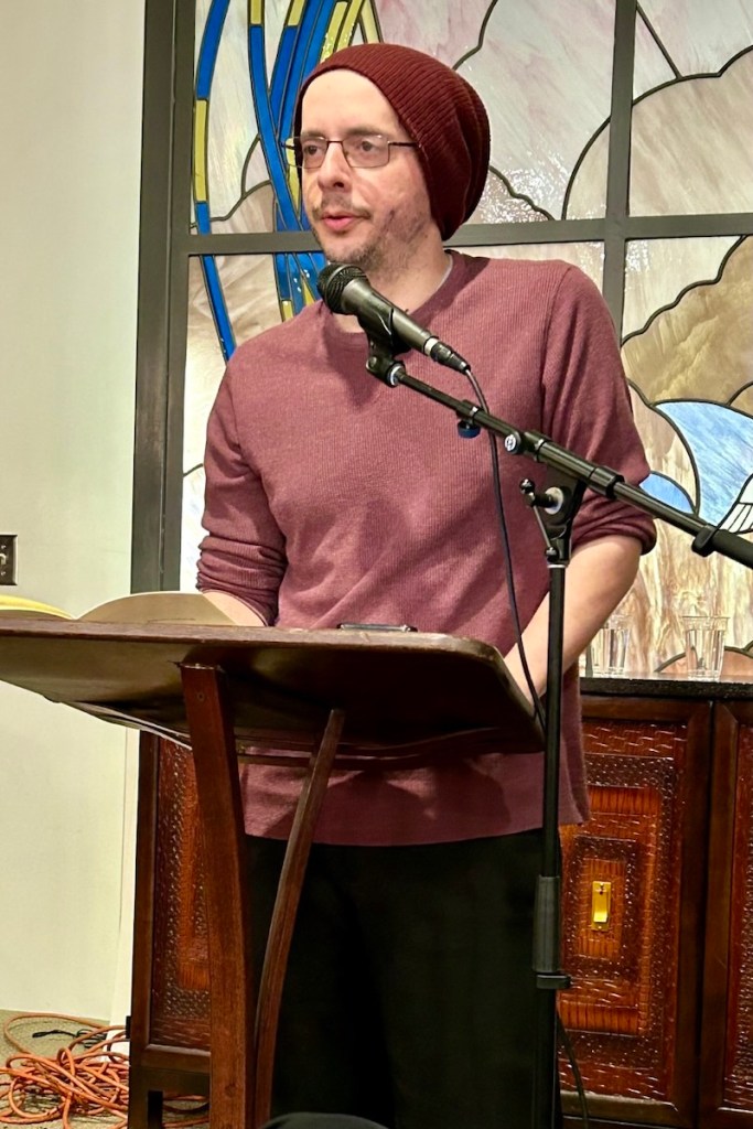 The second featured poet, introduced by co-host George Yatchisin, brought an equally striking dynamism to the evening. This was Sean Colletti, who is a founder of the Ventura County Poetry Festival and host of the (semi-)monthly event “Poetry in the Gallery” at the Studio Channel Islands Art Center, which features a combination of open mic performances and guest readers. Holding both a doctorate from the University of Birmingham (U.K.) and Slam poetry prizes, Colletti brings the love of poetry community and deep erudition to his work, which he shared both by reading and performing. His set ranged from poems about roadkill to the existential underpinnings of our relationships with each other mediated through video games. Underneath ran a continual invitation toward kindness and thoughtfulness as evidenced in the opening lines of this poem, which cites the Ancient Roman philosopher/emperor Marcus Aurelius: