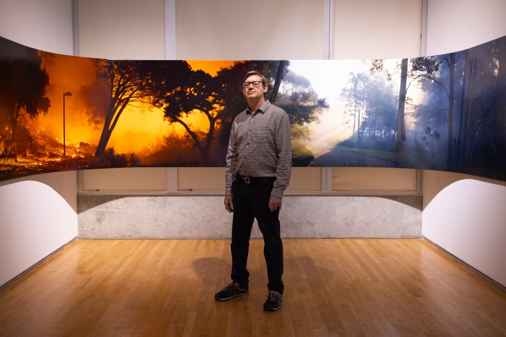 In 2021, I was approached by Judy Larson and Chris Rupp at the [Westmont] Museum, and I have been getting to know people and visiting with faculty there — I’m learning about their experiences as a community and their specific position on the mountain ecosystem. In my view, WILDLAND centers a space to contemplate and honor the Westmont community’s own experience going through the 2008 Tea Fire. I’d heard the story of 1,000 students, faculty, and staff sheltering in place in the school gym as the fire swept through campus. Then I learned that journalist Ray Ford had been out there alone with his camera, and the next morning, Brad Elliott captured the beginning of the recovery process. When I saw the special collection of these photos at the Westmont Library, I recognized that kind of transitional, emotional space from my own experiences documenting wildfire, and felt a combined, collaged scene could function as a special artifact of Westmont’s site and community resilience. As part of the exhibition, we decided to include outdoor and extended educational experiences, with talks, guided hikes of oak restoration, an outdoor projection event called “Ember Trees,” and an environmentally focused Family Day. The show has been an opportunity to advance a variety of multimedia practices in order to shift time and space in our perceptions of the landscapes where we live. I wanted to present fire and water, because for over a decade I’ve been focusing on both, sometimes separately, but this has provided me a good inner and practical balance, and I think observing them together offers us ways to consider personal and community resilience.