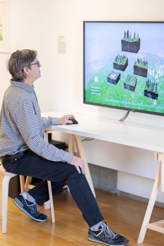 I know this is a loaded question, but who are you as an artist? In other words, how did you come to make this show? In 2013, I founded the Burn Cycle Project as a hub for collaboration and community engagement around wildfire. A lot of meaningful partnerships have come out of that, and it has a very public aspect, often involving pop-up exhibits of the “Walk into Wildfire” projection piece. The WILDLAND exhibit really leans into water as well with immersive video. Over the past decade, I’ve been iterating visualizations with Professor Naomi Tague about how water interacts with other forces in the landscape. “Tree Water” is a brand-new video installation that uses moving watercolor pigments to represent the hidden dynamics of soil, roots, and air. I’m really excited to share this work, and it’s been meaningful as a studio practice as well as something I now contemplate when I visit sites recovering from wildfires.