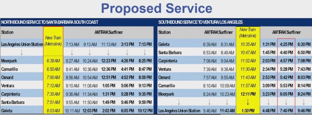 The new service uses a Metrolink train, a more flexible service that will start in Moorpark at 6:38 a.m., avoiding the earlier L.A. start time and rail traffic, said Aaron Bonfilio, SBCAG’s Director of Multimodal Programs. The afternoon returns will be the existing Amtrak trains that leave Goleta at 4:25 p.m. and 6:30 p.m.