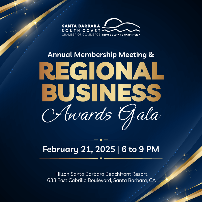 The Santa Barbara South Coast Chamber of Commerce, from Goleta to Carpinteria, is pleased to announce the recipients of the 2025 Regional Business Awards who will be celebrated during the Annual Membership Meeting and Regional Business Awards Gala on Friday, February 21, 2025 at the Hilton Santa Barbara Beachfront Resort. The evening will honor outstanding businesses and individuals who have made significant contributions to the economic vitality and community well-being on the South Coast.