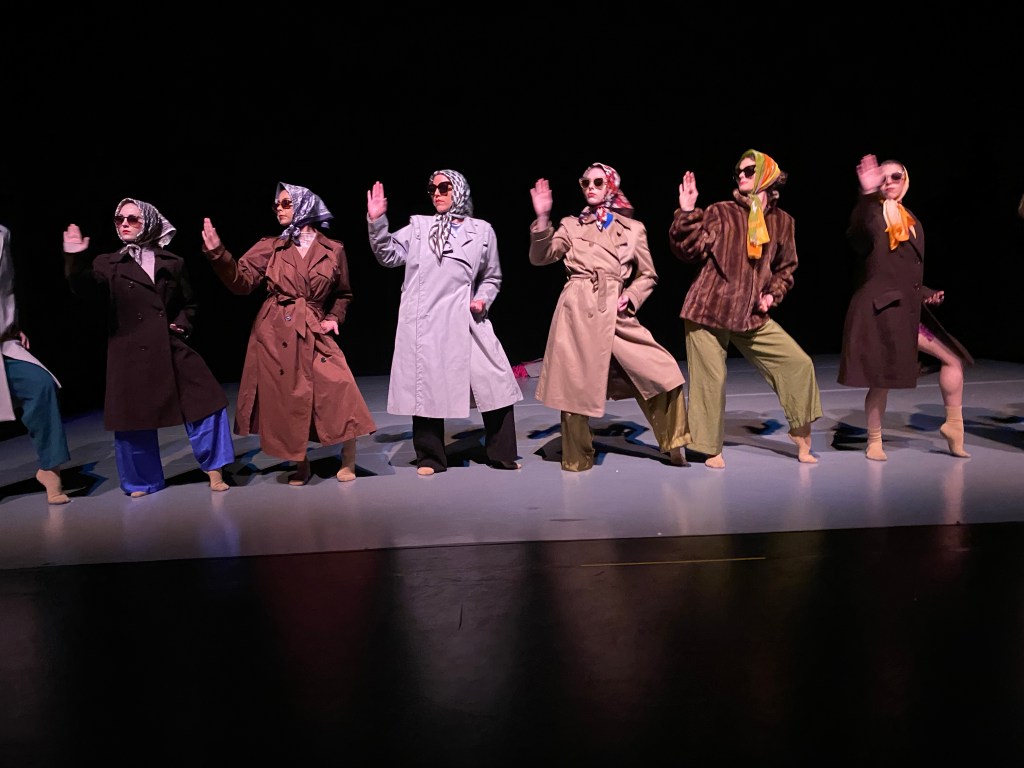 After the opening reading, the lights came up on the company dressed in trench coats, shades, and head scarves, dancing to a tango-sounding version of the famous “Habanera” from Georges Bizet’s 1875 opera Carmen, called (ominously) “Carmen’s Shadow.” And so the show proceeded, interleaving dialog and music, exploring questions of beauty, what it means to be female, and challenging stereotypes.