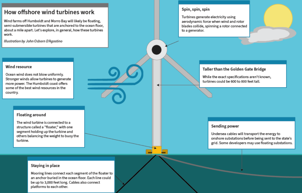 California’s wind farms would contain hundreds of giant turbines, each about 900 feet high — as tall as a 70-story building. While the platforms would mostly be unseen from the shoreline, some may be visible at night in some areas. In addition, the projects will require expansion of ports in Los Angeles, Long Beach and Humboldt Bay for storing, staging and assembling parts.