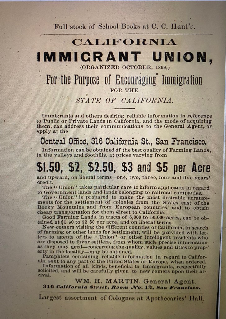 Game of various kinds abounds in the county. The famous grizzly may be met in the mountains, if anyone desires such an interview. Such meetings are not apt to be wholly satisfactory except to the grizzly, as he usually closes the proceedings by eating the interviewer. Hare are numerous, where the sage bush grows to afford them shelter. Rabbits are found everywhere. Wild ducks are abundant in the winter, on the miniature ponds in the fields, caused by the rains. Quail are plentiful in the foothills. There are many of the small brown or “cinnamon” bear in the mountains, and the California lion, a species of panther. Bear may even be seen grazing among the cattle as feed and water grow scarce in the late summer. The mountain streams offer fine trout to disciples of Izaak Walton, and there are as good fish in the sea as ever were caught for those who would angle more luxuriously.