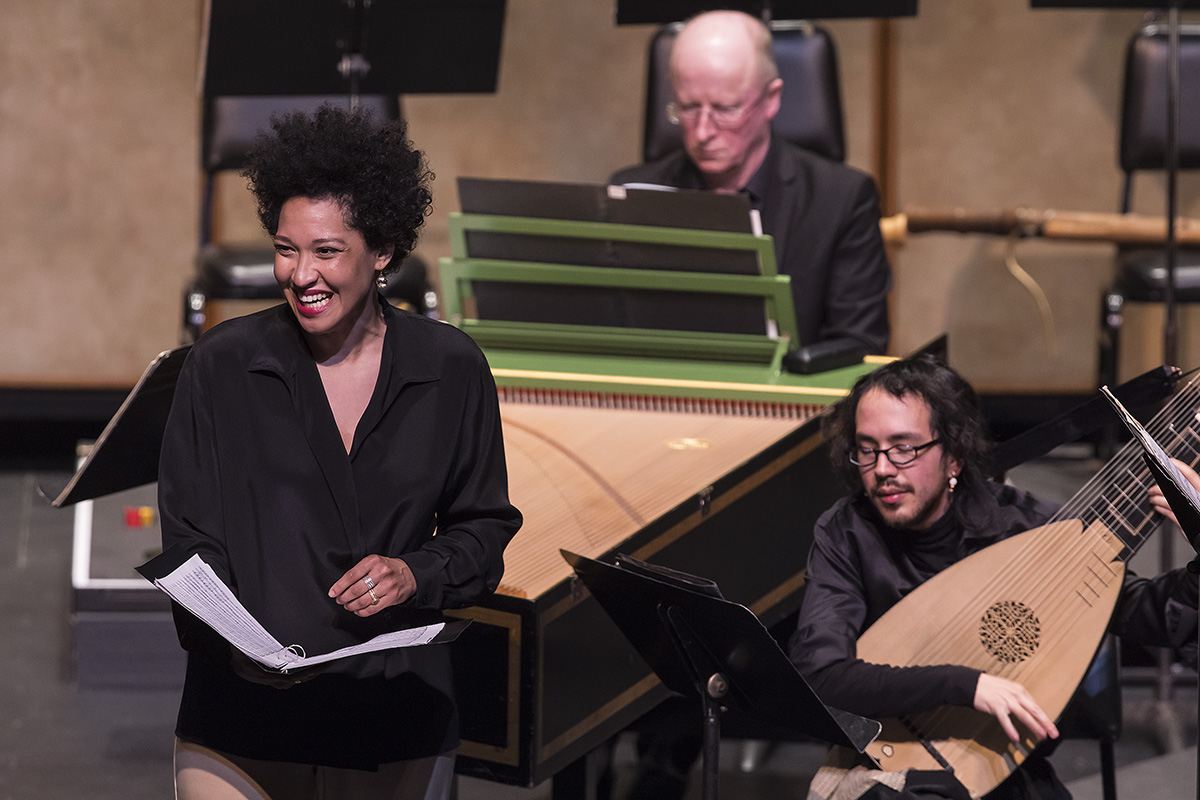 Pole dancing was not to be found on the Lobero stage, but the group’s vibrant and never static approach to the music managed to summon up sensual energies. Each of Bullock’s few appearances on stage seized our attentions and affections, from her measured restraint and gorgeous tone on Handel arias — “Verdi Prati,” from Alcina, and “Let the Bright Seraphim,” from Samson — to Purcell’s “If Love’s a Sweet Passion,” from The Fairy Queen.