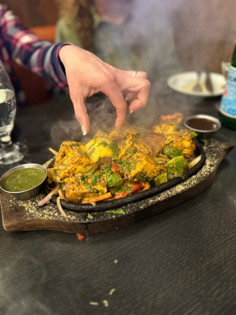 Then we dove into ordering things we’d never had before. First was the papdi chaat, six sour-sweet-lightly spiced panipuri-like puffs of dough filled with more crunchy things. Then the Karavali shrimp, a stir-fried dish flavored with a robust spice mix known as gunpowder. And then the most exciting of all: the Soufiya paneer tikka, in which large chunks of cheese are coated in ajwain seeds and turmeric, tossed with bell peppers and onions, and roasted in the tandoor. It came out crackling and steaming, much like a fajita plate, bringing sonic and visual flair to the already colorful dish.