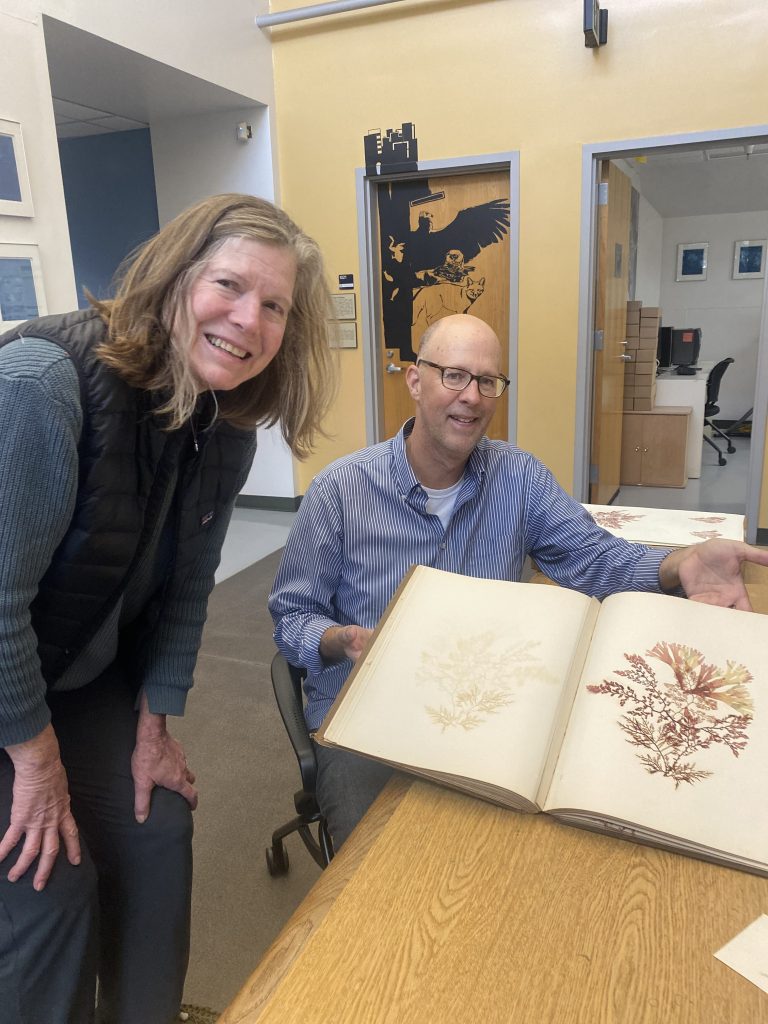 Mary Louise Sanchez and Gregory Wahlert examine Juliette Walker Fish’s seaweed scrapbook at the UCSB Cheadle Center. | Credit: Courtesy