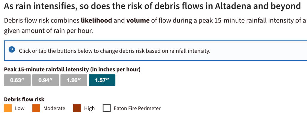 In the areas scarred by the Eaton Fire, just a fifth of an inch of rain could trigger a debris flow if it falls within 15 minutes, said Jeremy Lancaster, the state geologist who heads the California Geological Survey. The federal report pegged a higher threshold — with 1.57 inches of rain per hour or less than half an inch in the critical 15-minute span — very likely to initiate debris flows in the burned canyons.