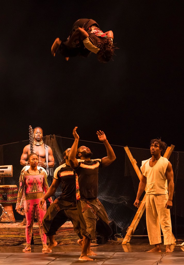 The lights come up to reveal a fishing village. The villagers, portrayed by the dancers and acrobats of Cirque Kalabanté, are preparing for the day, throwing nets, calling out to each other, and preparing baskets of fish.